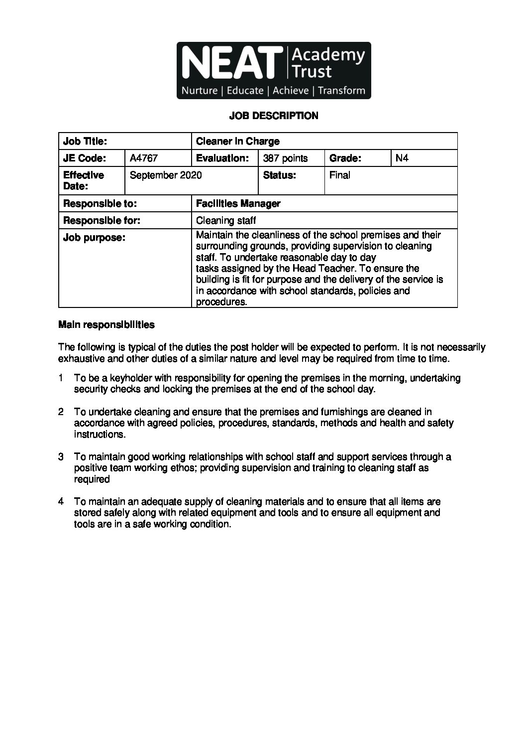 A4767 Cleaner in Charge Job Description