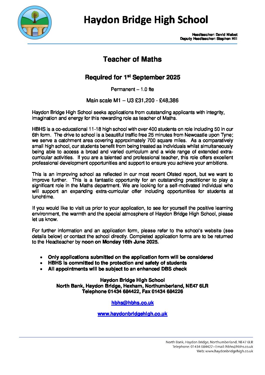 Advert – Teacher of Maths